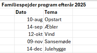 Til alle møder bestræber vi os på at være udendørs, vi opfordrer derfor til at både børn og voksne møder op, klædt på til at være ude. Vi laver altid noget spiseligt. Det er dog helt i orden, hvis man har behov for at medbringe sin egen madpakke.